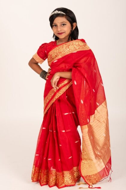 The Jamdani kids saree collection at Shop Saree Mela includes beautifully designed Tangail Jamdani styles created especially for young girls.