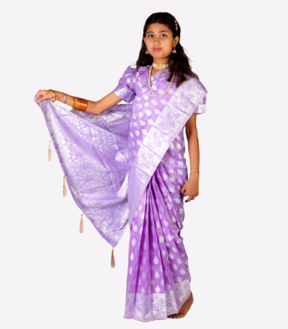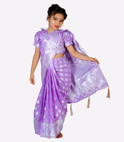Light Purple Katan Kids Ready Saree with Silver Thread